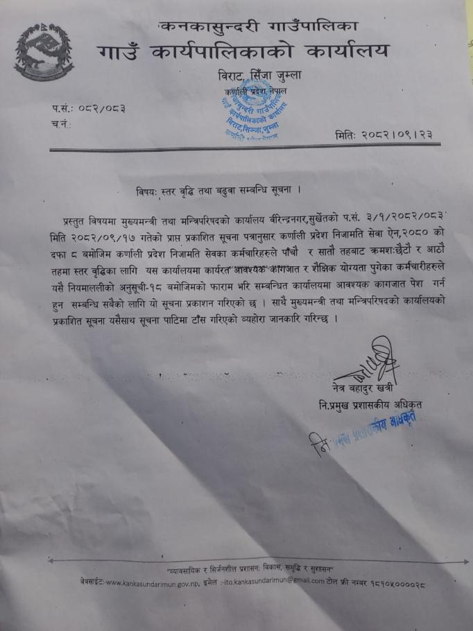 स्तर वृद्धि तथा बढुवा सम्बन्धि सुचना ।