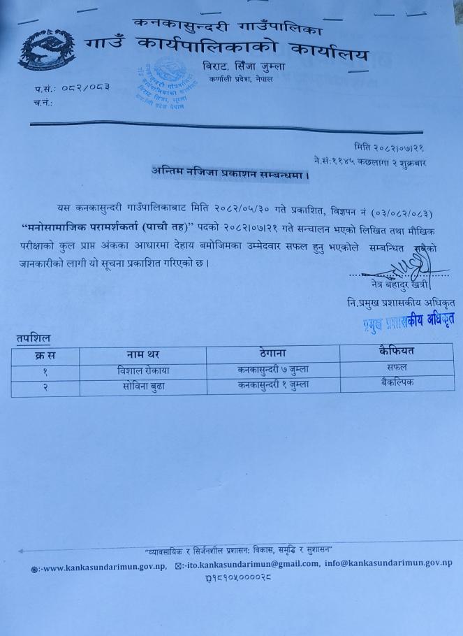 मनाेसामाजिक परामर्शकर्ता पदकाे अन्तिम नतिजा प्रकाशन सम्बन्धि सूचना ।